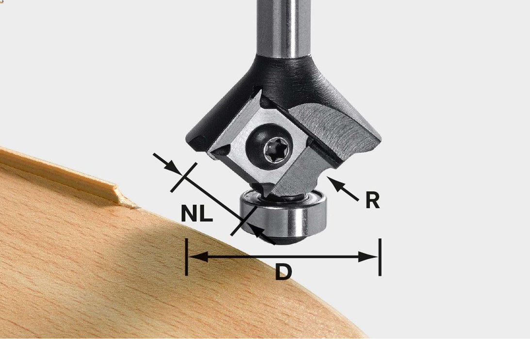 Cutter for rounding wood and plastic edges as well as solid wooden work pieces. Reversible carbide blade provides extreme precision, no re-sharpening required. Extremely economical due to long useful life. Reversible blades can be used 4 times and are easy to replace.